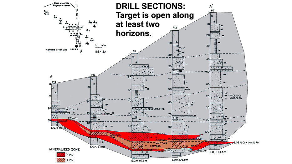 The deposit was first identified in 1966 when Scurry Rainbow Exploration drilled the area in search of potash. Although potash was not encountered, later analysis by Esso Minerals Canada in the 1980s revealed copper mineralization in archived chip samples. This led to a systematic diamond drilling program that ultimately delineated a copper-bearing zone hosted in grey, gritty sandstones, which are interbedded with redbed sandstones and mudstones. The mineralization occurs at depths between 35 and 110 meters and is closely associated with carbonaceous detritus, suggesting a strong redox-controlled deposition model.