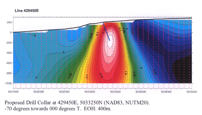 The anomaly is located near the southern, faulted, and mylonitized margin of the oxidized Pleasant Hills granite pluton. While outcrops are absent in the immediate vicinity, hematite-rich granite with 1-2% chalcopyrite and pyrite is present 5 km to the west. Strongly foliated granite along this section of the Cobequid Fault indicates syn- and post-intrusive movement. The target also with the convergence of the Londonderry, Rockland Brook, and Cobequid Faults. Inversion modelling suggests a dense source extending from the near surface to 1,000m depth. A 400m drillhole into the center of the anomaly is recommended.